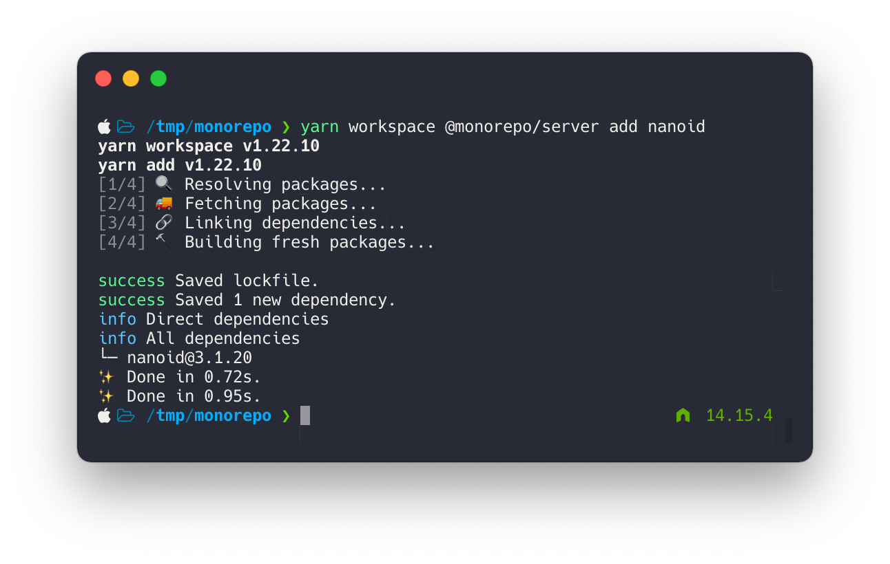 Notice how we add a workspace name (which equals to the name in package.json) to install the dependency only in that package.