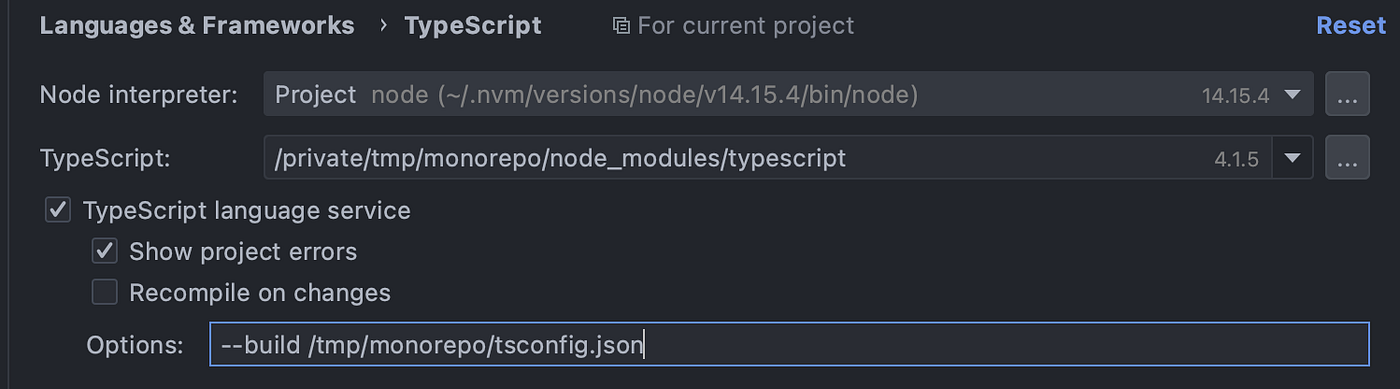 --build {path to your monorepo}/tsconfig.json. This is really important as it tells our TS compiler that it should always build our code using the build options.