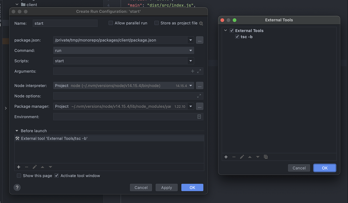 }The second one is trivial — we are just launching the start script in our client package. However, the first one is much more important as it tells our TypeScript compiler to find all referenced projects (and their tsconfig files), check if they are outdated, and build them in the correct order.